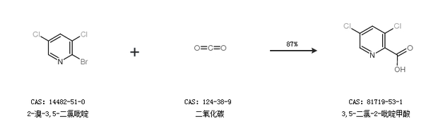 2.通过2-溴-3,5-二氯吡啶和二氧化碳合成3,5-二氯-2-吡啶甲酸,收率约87%;
