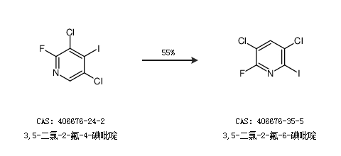 1.通过3,5-二氯-2-氟-4-碘吡啶合成3,5-二氯-2-氟-6-碘吡啶,收率约55%;