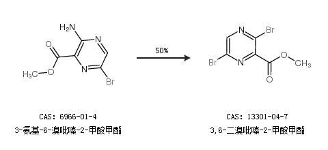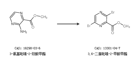 1.通过3-氨基-6-溴吡嗪-2-甲酸甲酯合成3,6-二溴吡嗪-2-甲酸甲酯,收率约50%;