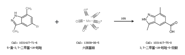 1.通过5-溴-3,7-二甲基-1H-吲唑和六羰基钼合成3,7-二甲基-1H-吲唑-5-羧酸,收率约16%;