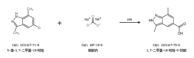 2.通过5-溴-3,7-二甲基-1H-吲唑和碳酸钠合成3,7-二甲基-1H-吲唑-5-羧酸,收率约16%;