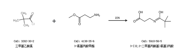 1.通过三甲基乙酰氯和3-氨基丙酸甲酯合成3-[(2,2-二甲基丙酰基)氨基]丙酸,收率约22%;