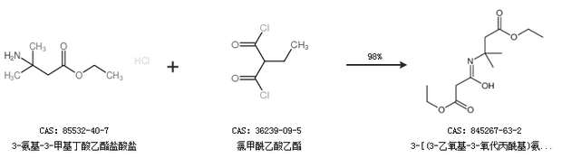 1.通过3-氨基-3-甲基丁酸乙酯盐酸盐和氯甲酰乙酸乙酯合成3-[(3-乙氧基-3-氧代丙酰基)氨基]-3-甲基丁酸乙酯,收率约98%;