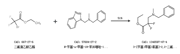 1.通过二氟溴乙酸乙酯和N-苄基-n-甲基-1H-苯并噻唑-1-甲胺合成3-[苄基(甲基)氨基]-2,2-二氟丙酸乙酯,收率约51%;