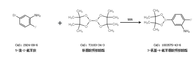 2.通过5-溴-2-氟苯胺和联硼酸频那醇酯合成3-氨基-4-氟苯硼酸频那醇酯,收率约99%;