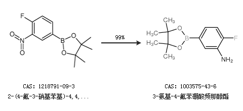1.通过2-(4-氟-3-硝基苯基)-4,4,5,5-四甲基-1,3,2-二噁硼烷合成3-氨基-4-氟苯硼酸频那醇酯,收率约99%;