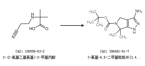 1.通过2-(2-氰基乙基氨基)-2-甲基丙酸合成3-氨基-6,6-二甲基吡咯并[3,4-C]吡唑-5(1H,4H,6H)-甲酸叔丁酯