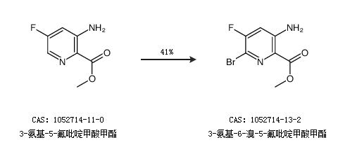 1.通过3-氨基-5-氟吡啶甲酸甲酯合成3-氨基-6-溴-5-氟吡啶甲酸甲酯,收率约41%;