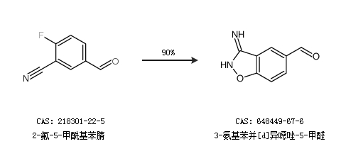 1.通过2-氟-5-甲酰基苯腈合成3-氨基苯并[d]异噁唑-5-甲醛,收率约90%;