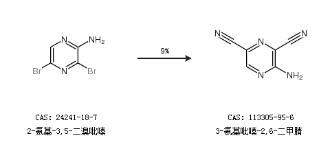 2.通过2-氨基-3,5-二溴吡嗪合成3-氨基吡嗪-2,6-二甲腈,收率约9%;