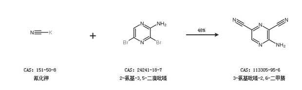 1.通过氰化钾和2-氨基-3,5-二溴吡嗪合成3-氨基吡嗪-2,6-二甲腈,收率约48%;