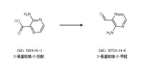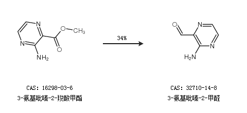 1.通过3-氨基吡嗪-2-羧酸甲酯合成3-氨基吡嗪-2-甲醛,收率约34%;