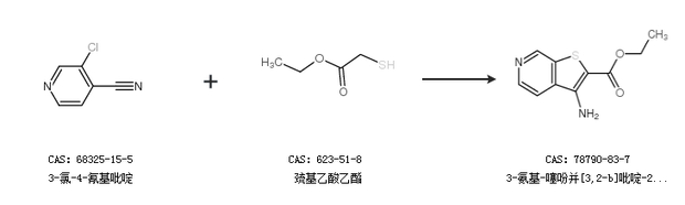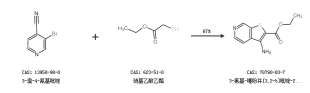 1.通过3-溴-4-氰基吡啶和巯基乙酸乙酯合成3-氨基-噻吩并[3,2-b]吡啶-2-羧酸甲酯,收率约67%;