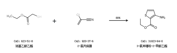 1.通过巯基乙酸乙酯和2-氯丙烯腈合成3-氨其噻吩-2-甲酸乙酯,收率约88%;