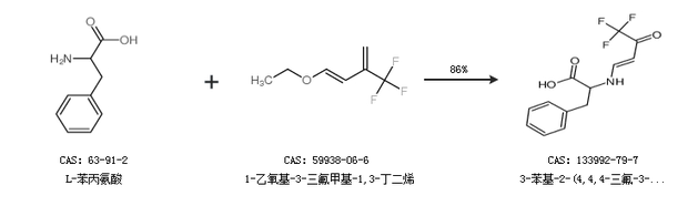1.通过L-苯丙氨酸和1-乙氧基-3-三氟甲基-1,3-丁二烯合成3-苯基-2-(4,4,4-三氟-3-氧代-1-丁烯氨基)-丙酸,收率约86%;
