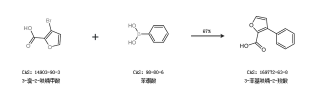 1.通过3-溴-2-呋喃甲酸和苯硼酸合成3-苯基呋喃-2-羧酸,收率约67%;