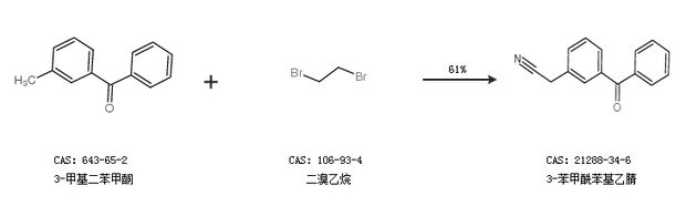 1.通过3-甲基二苯甲酮和二溴乙烷合成3-苯甲酰苯基乙腈,收率约61%;