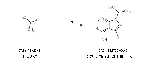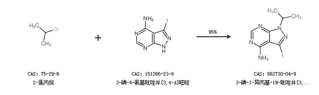 2.通过2-氯丙烷和3-碘-4-氨基吡唑并[3,4-d]嘧啶合成3-碘-1-异丙基-1H-吡唑并[3,4-D]嘧啶-4-胺,收率约95%;