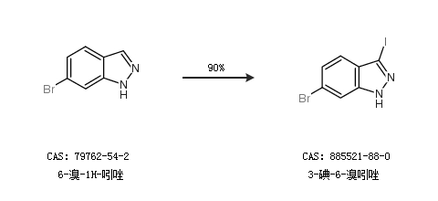 1.通过6-溴-1H-吲唑合成3-碘-6-溴吲唑,收率约90%;