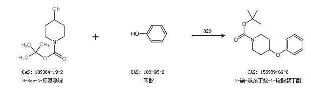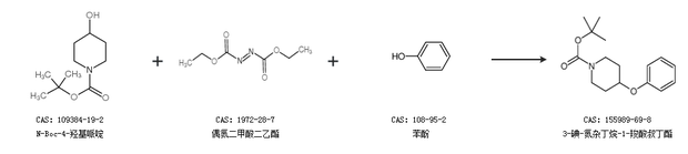 2.通过N-Boc-4-羟基哌啶、偶氮二甲酸二乙酯和苯酚合成3-碘-氮杂丁烷-1-羧酸叔丁酯