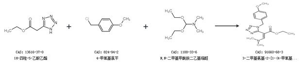 1.通过1H-四唑-5-乙酸乙酯、4-甲氧基氯苄和N,N-二甲基甲酰胺二乙基缩醛合成3-二甲基氨基-2-[1-(4-甲氧基-苄基)-1H-四唑-5-基]-丙烯酸乙酯