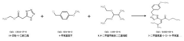 1.通过1H-四唑-5-乙酸乙酯、4-甲氧基氯苄和N,N-二甲基甲酰胺二乙基缩醛合成3-二甲基氨基-2-[2-(4-甲氧基-苄基)-2H-四唑-5-基]-丙烯酸乙酯