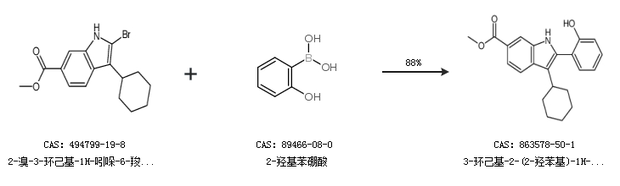 1.通过2-溴-3-环己基-1H-吲哚-6-羧酸甲酯和2-羟基苯硼酸合成3-环己基-2-(2-羟苯基)-1H-吲哚-6-羧酸甲酯,收率约88%;
