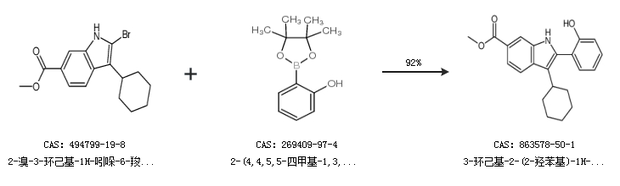 2.通过2-溴-3-环己基-1H-吲哚-6-羧酸甲酯和2-(4,4,5,5-四甲基-1,3,2-二杂氧戊硼烷-2-基)苯酚合成3-环己基-2-(2-羟苯基)-1H-吲哚-6-羧酸甲酯,收率约92%;