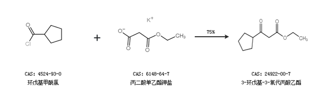 2.通过环戊基甲酰氯和丙二酸单乙酯钾盐合成3-环戊基-3-氧代丙酸乙酯,收率约75%;