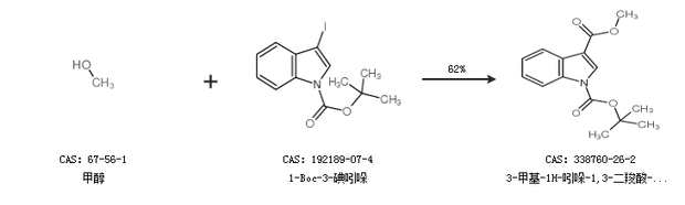 2.通过甲醇和1-Boc-3-碘吲哚合成3-甲基-1H-吲哚-1,3-二羧酸-1-叔丁酯,收率约62%;