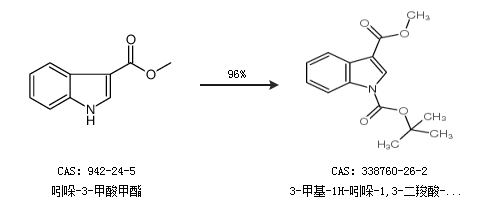 1.通过吲哚-3-甲酸甲酯合成3-甲基-1H-吲哚-1,3-二羧酸-1-叔丁酯,收率约96%;
