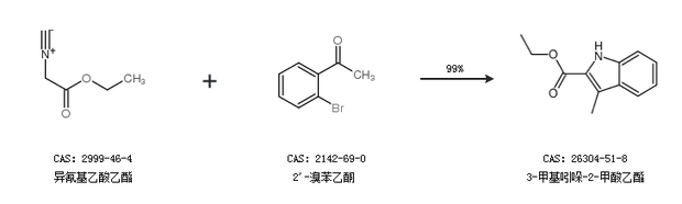 1.通过异氰基乙酸乙酯和2''-溴苯乙酮合成3-甲基吲哚-2-甲酸乙酯,收率约99%;