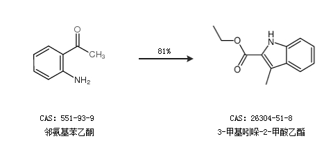 2.通过邻氨基苯乙酮合成3-甲基吲哚-2-甲酸乙酯,收率约81%;