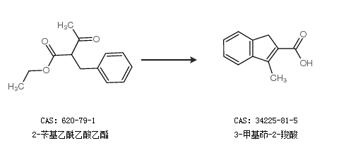 1.通过2-苄基乙酰乙酸乙酯合成3-甲基茚-2-羧酸,收率约67%;