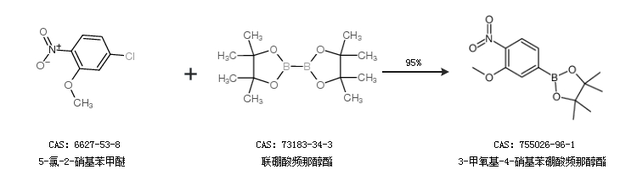 1.通过5-氯-2-硝基苯甲醚和联硼酸频那醇酯合成3-甲氧基-4-硝基苯硼酸频那醇酯,收率约95%;