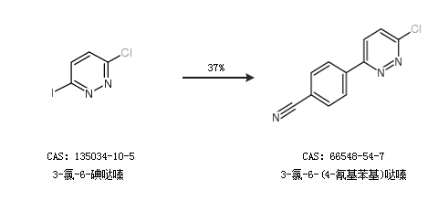 2.通过3-氯-6-碘哒嗪合成3-氯-6-(4-氰基苯基)哒嗪,收率约37%;