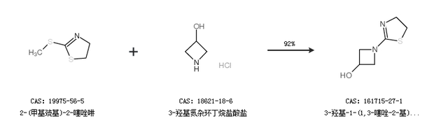 1.通过2-(甲基巯基)-2-噻唑啉和3-羟基氮杂环丁烷盐酸盐合成3-羟基-1-(1,3-噻唑-2-基)氮杂丁烷,收率约92%;
