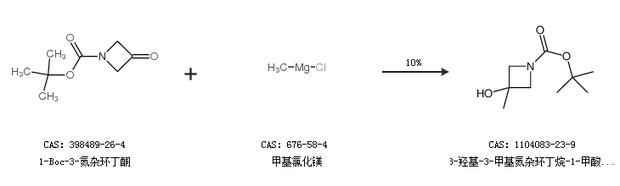 2.通过1-Boc-3-氮杂环丁酮和甲基氯化镁合成3-羟基-3-甲基氮杂环丁烷-1-甲酸叔丁酯,收率约10%;