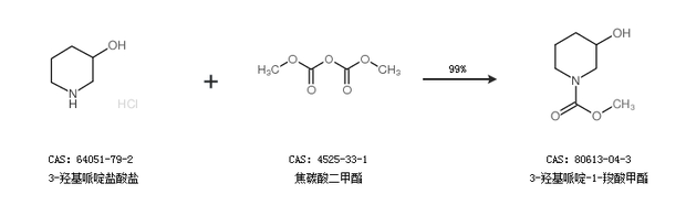 1.通过3-羟基哌啶盐酸盐和焦碳酸二甲酯合成3-羟基哌啶-1-羧酸甲酯,收率约99%;