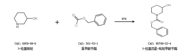 2.通过3-羟基哌啶和氯甲酸苄酯合成3-羟基四氢-吡啶甲酸苄酯,收率约97%;
