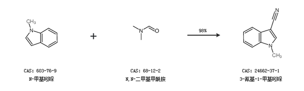1.通过N-甲基吲哚和N,N-二甲基甲酰胺合成3-氰基-1-甲基吲哚,收率约98%;