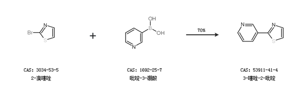 2.通过2-溴噻唑和吡啶-3-硼酸合成3-噻唑-2-吡啶,收率约70%;