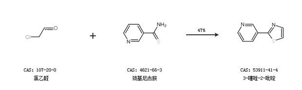 1.通过氯乙醛和巯基尼古胺合成3-噻唑-2-吡啶,收率约47%;