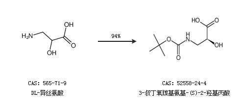 1.通过DL-异丝氨酸合成3-叔丁氧羰基氨基-(S)-2-羟基丙酸,收率约94%;