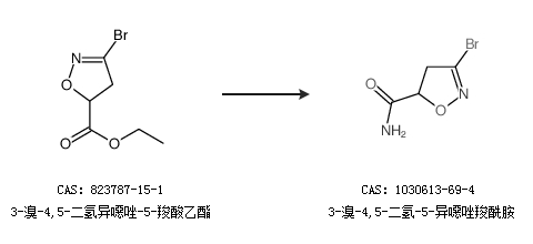 1.通过3-溴-4,5-二氢异噁唑-5-羧酸乙酯合成3-溴-4,5-二氢-5-异噁唑羧酰胺