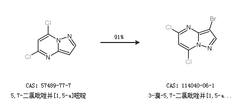 1.通过5,7-二氯吡唑并[1,5-a]嘧啶合成3-溴-5,7-二氯吡唑并[1,5-a]嘧啶,收率约91%;
