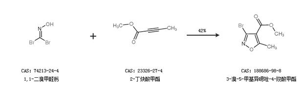 1.通过1,1-二溴甲醛肟和2-丁炔酸甲酯合成3-溴-5-甲基异噁唑-4-羧酸甲酯,收率约42%;