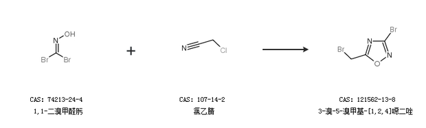 2.通过1,1-二溴甲醛肟和氯乙腈合成3-溴-5-溴甲基-[1,2,4]噁二唑