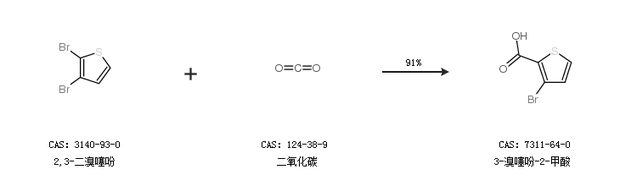 1.通过2,3-二溴噻吩和二氧化碳合成3-溴噻吩-2-甲酸,收率约91%;