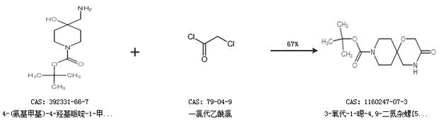 1.通过4-(氨基甲基)-4-羟基哌啶-1-甲酸叔丁酯和一氯代乙酰氯合成3-氧代-1-噁-4,9-二氮杂螺[5.5]十一烷-9-羧酸叔丁酯,收率约67%;